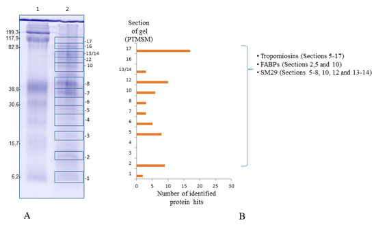 Several protein fragments and peptides were mass-detected more than once along the gel lanes in 1D Sm-AWBE gel electrophoresis separation (Figure 1A), in different molecular weight range sections (7–100 kDa range) (Figure 1A,B). In adult worms, it seems that we have various tropomyosin isoforms as well as several actins (Figure 1).