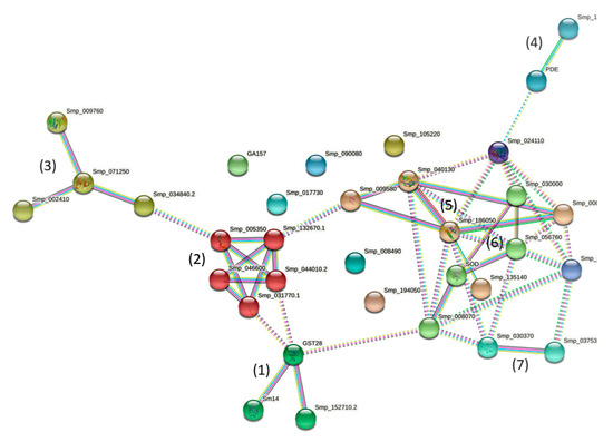 Sm-AWBE protein network (STRING analysis, https://string-db.org/, accessed on 9 December 2021). A cluster and protein groups appeared after applying the MLC inflation algorithm. (I) Proteins showing protein–protein interactions (PPIs): (1) Detoxifying transferases GST omega, GST28 mu, and FABP/Sm14 (fatty-acid binding protein); (2) Cluster with proteins involved in muscle contraction; (3) 14-3-3 regulatory proteins bound to rap1; (4) phosphoesterases; (5) chaperones/foldases; modulatory proteins; (6) antioxidant/redox proteins; (7) CALR, Trx-Mt. (II) Proteins without PPIs: Sm13/GA157, Sm200, serpin, DIF_5, ENO, Glycogenin-related, clfA, DLD.