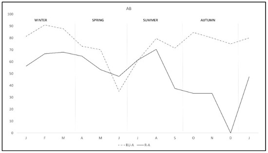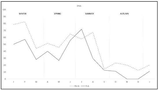 During the study there was a clear overall pattern of C. burnetii DNA excretion and subsequent antibody production (Figure 1). In the first two months of the study—winter—72.7% of the rabbits excreted DNA, decreasing from March to May—spring—and rising again from June to August—summer—and finally decreasing to the lowest levels from September to January—autumn-winter. Correspondingly antibody pattern was similar but lagged some weeks behind DNA excretion until September, when the antibody level remained established. Interestingly, the pattern of DNA excretion in both study areas was similar, although monthly percentage in R-A was lower than in RU-A along the study except in July (Figure 2).