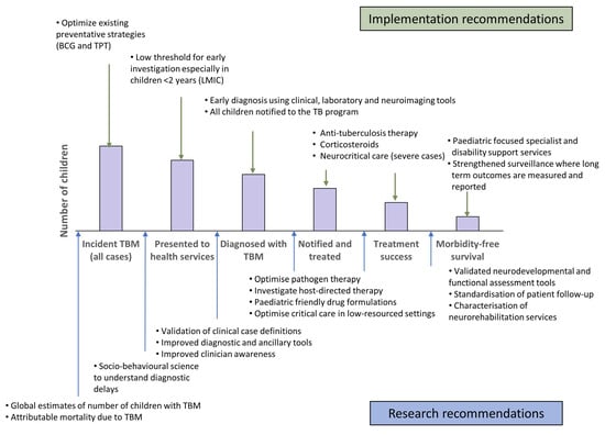 The cascade of care for children with tuberculous meningitis, illustrating how new research developments and optimised programmatic care could reduce drop off at each stage. BCG: bacille Calmette–Guérin; TPT: tuberculosis preventive therapy; LMIC: low- and middle-income country; TBM: tuberculous meningitis; TB: tuberculosis.