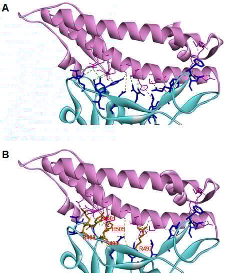 The main interactions between the viral spike and the host ACE2 for the Omicron variant are shown in Figure 1. The mutated residues in the RBD that directly interact with ACE2 are shown in orange. Interestingly, most of these residues are localized in the region between 493 and 505, which was previously described as important for the evolution between SARS-CoV and SARS-CoV-2 [7]. Furthermore, evaluation of the individual SARS-CoV-2 spike mutations in residue 505 revealed that the change from tyrosine to tryptophan resulted in the lower binding free energy interaction complex. In the Omicron variant, Y505 is substituted by the histidine residue, which resulted in fewer pi–pi interactions than observed for the double aromatic ring present in tryptophan [15]. However, histidine flexibility produces an increase in the number of interactions of the viral spike with other residues of ACE2, including E35 and D355, which could further stabilize the interaction between the spike and the host receptor (Table 4). In addition, other mutated residues, such as R493, Y501, and R498, showed changes in the type and number of interactions with ACE2 that are most likely related to conformational changes occurring in the spike protein, enhancing the overall stability of the spike–ACE2 complex (Table 4).