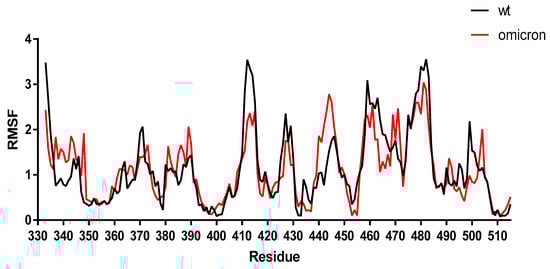 Changes in the pattern of flexibility in the interaction between the spike protein–ACE2 receptor complexes for Omicron and WT. The root-mean-square fluctuation (RMSF) of the protein Cα atoms with the respect to the initial structure for the evaluated spike protein–ACE2 complex was obtained by molecular docking. The spike protein–ACE2 receptor complexes were evaluated using the CABS-flex software [28]. The PDB files were submitted to the CABS-flex server to further assess the stability of the spike protein mutants–ACE2 complexes, and the parameters were adjusted to the default. The MD simulations output data obtained with both software were analyzed according to RMSF. This software enables an efficient modeling procedure for short simulations, being able to produce an analysis of the protein dynamics consistent with the dynamics obtained from 10-nanoseconds MD simulations with the most popular force fields.