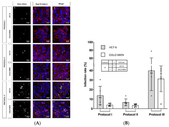 Infection rate results are presented as mean ± SD of six replicates for each condition. For evaluation of infection rates obtained through the three applied infection protocols, a one-way analysis of variance (ANOVA) with Tukey’s test was performed, using GraphPad Prism 8® software with a significance level of 5%. For evaluation of parasitic development, by means of protocol III (Figure 2), two-tailed t-test was used, comparing the infection rate observed in HCT-8 and COLO-680N cell lines each day. Significance values are presented as follows: *** = p ≤ 0.001, ** = p ≤ 0.01.