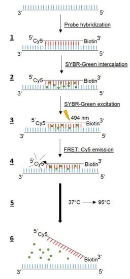 To find reliable assay conditions, we first generated plasmid DNAs harboring two defined WT sequences (WT1 and WT2) and six MT QRDR sequences (MT1 to MT6) as shown in Table 1 and Table 2, respectively. We decided not to use different fluorescent labels, which would allow two probes to be used at the same time to avoid misinterpretations, since all probes bind to the same region. A single-stranded DNA probe complementary to the QRDR WT1 sequence, labeled with Cy5 at the 5′ end and biotin at the 3′ end to prevent polymerization, was used for melting curve analyses (Table 3). SYBR-green, a dye intercalating into double-stranded DNA was added to the reaction mix. RT-PCR and subsequent melting curve analysis (Table 4) was performed according to the scheme shown in Figure 1. The Cy5 WT1 probe binds specifically to the region harboring codons 87 and 91 of the amplified DNA, while SYBR-green intercalates into the double-stranded DNA. The excitation of SYBR-green at 494 nm results in FRET to the Cy5 label, and Cy5 emission can be detected at 670 nm. Applying a temperature-gradient (37 °C to 95 °C) leads to dissociation of the Cy5 probe at a specific temperature and, thus, the FRET signal abates. Accordingly, mutations in the QRDR template DNA will give rise to lower Tm values due to the weaker binding of the Cy5 probe, which is 100% complementary to only the WT1 QRDR.