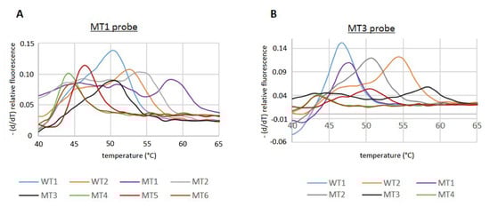 However, since the Tm values of some of the MT PCR products were very similar compared to the WT, it was not possible to unambiguously distinguish between all MT and WT sequences with just one of the Cy5 probes. Using the MT3 probe, no discrimination of the Tm of the WT1/MT1, MT2/MT5, and MT4/MT6 was possible. However, the MT1 probe allowed us to distinguish between the WT1 and MT1 sequence, but the discrimination of WT2/MT2, WT1/MT3, and MT4/MT6 could not be achieved (Figure 2; Table 5).
