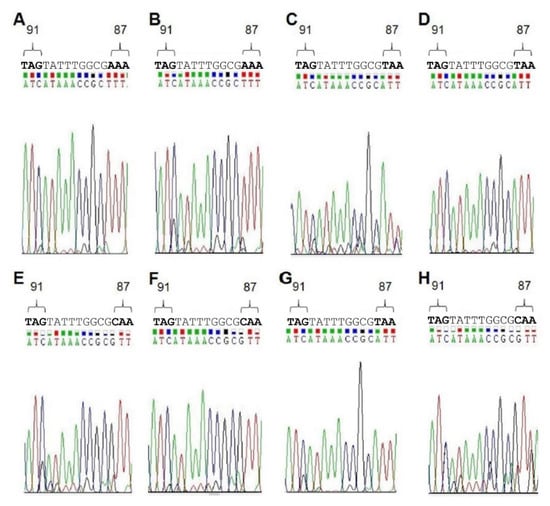 Finally, to further examine the validity of our results, we analyzed DNA isolated from biopsies taken from patients with known H. pylori infections. Each sample was tested with the MT1, as well as with the MT3 probe. In addition, to confirm the results obtained by melting curve analyses, the patient DNAs were sequenced to determine the QRDR genotype (Table 6, Figure 3). All sequencing data were in agreement with the genotype determined by RT-PCR (Table 6, Figure 3). As negative controls, and to determine the specificity of our test, we isolated biopsy DNA from six patients known not to be infected with H. pylori and performed RT-PCR with the QRDR primers. As expected, no QRDR sequence could be detected in all cases (Table 6, bottom, Supplementary Data, Figure S1A,B), which confirms the good specificity of this test.