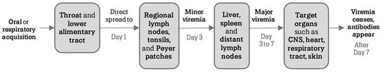 Following oral or respiratory transmission, EVs reach the pharynx and the alimentary tract and subsequently spread to regional lymphoid tissues (tonsils, Peyer patches, and regional lymph nodes). The viremia occurs in a few days; EVs spread to the reticuloendothelial system, including liver, spleen, bone marrow and more distant lymph nodes. Host immune responses may limit the viral replication, preventing the spread of infection to other sites (subclinical infection). In contrast, the replication in the reticuloendothelial system may lead to a major, secondary viremia (after 3 to 7 days), which involves the CNS, heart and skin, and overlaps to the onset of symptoms. The viral load in secondary sites usually reduces after approximately seven days. Antibodies are the most important immune defense against EVs infections, and viremia recovers when type-specific neutralizing antibody levels increase [29].