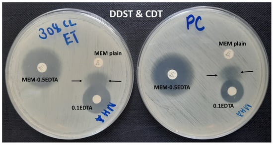 Combine disk test (CDT; MEM plain and MEM-0.5EDTA) and double-disk synergy test (DDST; MEM plain and 0.1EDTA) performed on the same plate, showing a positive result for the test organism (left) and a positive result for the control organism (right).