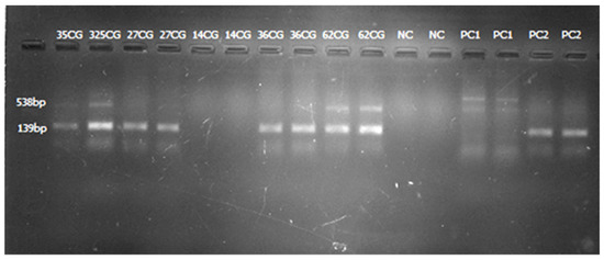 A modified protocol of the multiplex PCR technique by Dallenne et al. 2010 [18] was used for the amplification of blaIMP and blaKPC genes. The blaIMP gene (amplicon size 139 bp; New England BioLabs, Hertfordshire, UK) was amplified using the forward primer 5′-TTGACCACTCCATTTACDG-3′ and the reverse primer 5′-GATYGAGAATTAAGCCACYCT-3′, whereas the blaKPC gene (amplicon size 538 bp; New England, BioLabs, UK) was amplified using the forward primer 5′-CATTCAAGGGCTTTCTTGCTGC-3′ and the reverse primer 5′-ACGACGGCATAGTCATTTGC-3′. Briefly, 4 µL of the DNA sample was subjected to each multiplex PCR in a 25 µL reaction mixture containing 2.5 µL of a PCR buffer (10×), 2 µL of Q-solution, 0.5 µL of dNTPs (10 nM), 1 µL of MgCl2 (50 mM), 0.3 µL of Taq polymerase, 3 µL of each primer (10 mM), and 2.7 µL of nuclease-free water. Amplification was carried out on a thermal cycler (Bio-Rad; Thermo-Fishers scientific, Jurong, Singapore). The initial step was activation (at 94 °C for 10 min), followed by 35 cycles of denaturation at 94 °C for 40 s, annealing at 55 °C for 40 s, and elongation at 72 °C for 60 s and the final elongation at 72 °C for 7 min. The PCR product were visualized under UV light using a gel documentation system (Vilber; Seoul, Korea) after running a gel electrophoresis at 100 V for 1 h on 1.5% agarose gel stained with SYBR DNA safe stain.