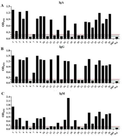 Specifically, of the 29 included patients, 21 showed moderate to high reactivity, even at high dilution for IgA, IgG, and IgM detection, respectively. With OD450 ≥ 1 at 1/100 dilution, all these 21 patients were considered true-positive for IgA, IgG, and IgM according to the ELISAs’ manufacturer instructions (Figure 1, Supplementary Figures S1 and S2).