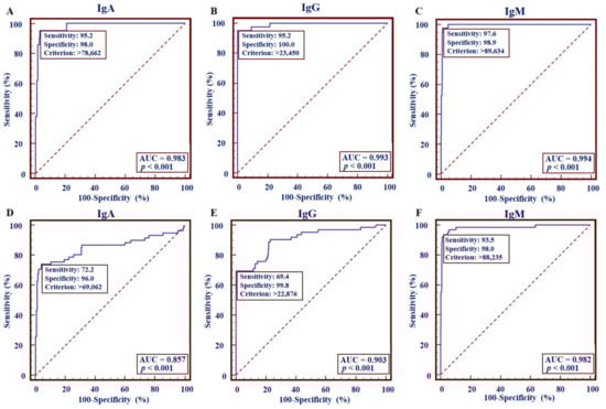 Performance of VZV-gE specific IgA, IgG, and IgM detection kits. The receiver-operating characteristic (ROC) curve analysis for detection of anti-IgA, IgG, and IgM antibodies against VZV-gE protein obtained from 42 ELISA positive samples, regardless (A–C), and considering as positive (D–F) the equivocal patient samples. The area under the curve (AUC) and the p-value are shown.