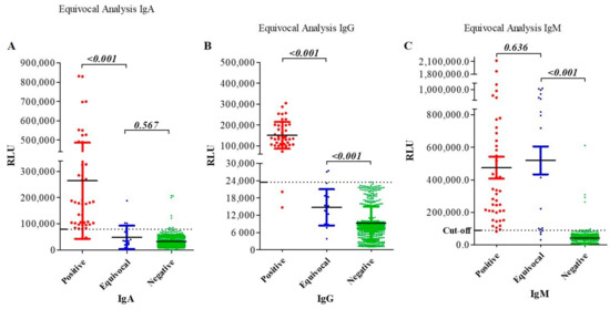 To assess the diagnostic ability of the CLIA kit to diagnose the samples classified as equivocal by a standard ELISA tests, individual and combined detection of IgA, IgG, and IgM were conducted with the CLIA-based diagnostic approach in the eight-patient cohort. These results were analyzed along with previous cohort results and compared to those from ELISA. The comparative analysis was based on previously obtained IgA, IgG, and IgM criteria (>78662 RLU, >23450 RLU, and >89634 RLU, respectively) (Figure 2A–C) and the validation criteria of standard ELISAs.