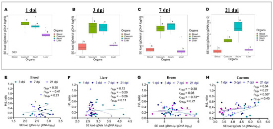 2.2. Differences in Salmonella Enteritidis Load in the Blood, Ileum, Caecum, and Liver at 1, 3, 7, and 21 Days after Infection, and Association with H/L Ratio