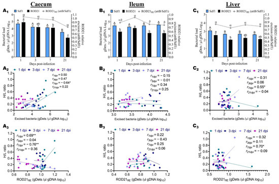In the same perspective, in order to establish the relationship between the H/L ratio and the colonization resistance, we assessed the frequency of excision of ROD21 in the liver and different portions of the gastrointestinal tract (ileum and caecum) during the infective cycle. First, the Sdf1 sequence was used to detect the total number of bacteria and attB was used to detect the bacteria that underwent excision. Then, we assessed the excision frequency by calculating the ROD21 relative excision (ROD21RE = attB gDets/Sdf1 gDets). We observed that the ROD21 absolute and relative excision calculated in these tissues varied from 2.02 to 4.91 gDets/µL gDNA and from 0.75 to 1.04, respectively (Figure 3A1,B1,C1). Moreover, we observed that the number of Salmonella enteritidis that underwent excision was increased in the caecum (Figure 3A1) and ileum (Figure 3B1) compared to that of the liver (Figure 3C1). Notably, the relative ROD21 excision observed at 3 dpi in the ileum (Figure 3B1) was significantly increased and almost equivalent to that observed at 1 dpi in the caecum (Figure 3A1).