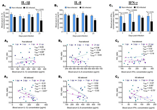 Determination of blood serum IL-1β, IL-8, and IFN-γ concentration during the infective cycle and association with the H/L ratio. After infection, the quantification of IL-1β (A1), IL-8 (B1), and IFN-γ (C1) in the blood serum was performed using enzyme-linked immunosorbent assays (ELISAs) (six to seven birds were used per group at each time point). (A2,A3) Correlation between H/L ratio and IL-1 β blood serum concentration in non-infected and SE-infected, respectively. (B2,B3) Correlation between H/L ratio and IL-8 blood serum concentration in non-infected and SE-infected, respectively. (C2,C3) Correlation between H/L ratio and IFN-γ blood serum concentration in non-infected and SE-infected, respectively. One-way ANOVA with Tukey’s post-test (α = 0.05) was used to compare different time points post-infection, and the results showed no significant differences for the three cytokines. Comparisons between the two groups during the infective cycle were performed by two-way ANOVA with Sidak’s post-test α = 0.05; correlations between the H/L ratio and the blood serum immune indicator were analyzed by Pearson correlation with Student’s t-test (one tail). * p < 0.05, ** p < 0.01 and *** p < 0.001.