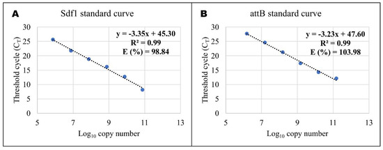 To determine the bacterial (Salmonella enteritidis) load and the Salmonella enteritidis region of difference 21 (ROD21) excision throughout the infective cycle in the blood, liver, ileum, and caecum, gDNA of 10–12 birds from each group were used. Quantitative real-time PCR (Q-PCR) was performed using TaqMan probes and KAPA PROBE FAST qPCR Master Mix (2×) Kit (KAPA BIOSYSTEMS, US Wilmington, Mass, USA: Wilmington, NC, USA), according to the manufacturer’s instructions, for volume total of 20 µL of the reaction mixture. Primers and fluorescent probes (5′FAM-TAMRA3′) for Salmonella differentiating fragment 1 (Sdf1) and attB [14] were used in this study (Table 1). To quantify the copy number in different organs, we used a standard curve for Sdf1 (Figure 5A) and attB (Figure 5B). The amplification system was as follows: 95 °C for 30 s, 40 cycles of 95 °C 5 s, and 60 °C for 34 s, with an additional step of 60 °C for 15 s at the end.