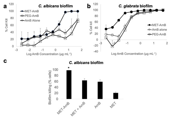 Antifungal activity of AmB formulations in Candida biofilms grown at 35 °C, for 24 h (RPMI-1640 media) in polystyrene flat bottomed 96-well microtiter plates and the average of three separate experiments: (a) Anti-fungal activity in C. albicans biofilms (EC50 MET-AmB = 1.18 ± 0.54 μg mL−1, EC50 PEG-AmB = 29.09 ± 12.18 μg mL−1, EC50 AmB alone = 24.74 ± 22.72 μg mL−1, EC50 MET alone—data not shown - > 300 μg mL−1), (b) anti-fungal activity in C. glabrata biofilms (EC50 MET-AmB = 0.03 ± 0.01 μg mL−1, EC50 PEG-AmB = 0.29 ± 0.06 μg mL−1, EC50 AmB = 0.08 ± 0.03 μg mL−1), and (c) antifungal activity in C. albicans biofilms with various AmB formulations containing 6 μg mL−1 AmB (MET-AmB = AmB encapsulated within MET nanoparticles, MET + AmB = empty MET nanoparticles added with AmB solution, AmB = AmB alone, MET = MET alone devoid of AmB), * = statistically significantly different from all other formulations (p < 0.05).