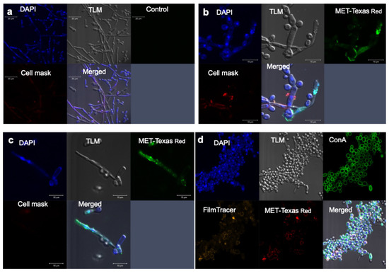 Confocal laser scanning microscopy cell imaging of C. albicans biofilms grown in RPMI-1640 media at 35 °C—(a) biofilm grown on a microscope cover slip for 24 h with no treatment, (b) biofilm grown on a microscope cover slip for 24 h and then treated with MET-Texas Red (50 μg mL−1) for 24 h, (c) biofilm grown on a microscope cover slip for 24 h and then treated with MET-Texas Red (100 μg mL−1) for 24 h, and (d) biofilm grown on a collagen-coated microscope cover slip for 7 days and then treated with MET-Texas Red (50 μg mL−1) for 24 h.