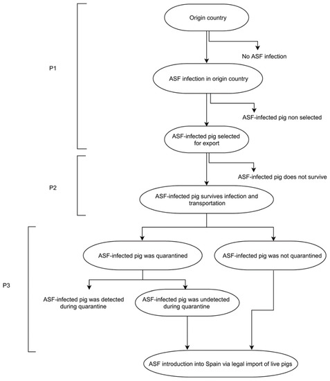 The conditional probability (pcm) was estimated as the product of three independent events. The probability of selecting an infected pig from country c before detection of ASFV infection (P1); the probability that the infected pig survives and reaches the holding (P2); and the probability that the imported pig has effective contact with at least one susceptible animal in the holding, resulting in disease transmission (P3) (see Figure 1).