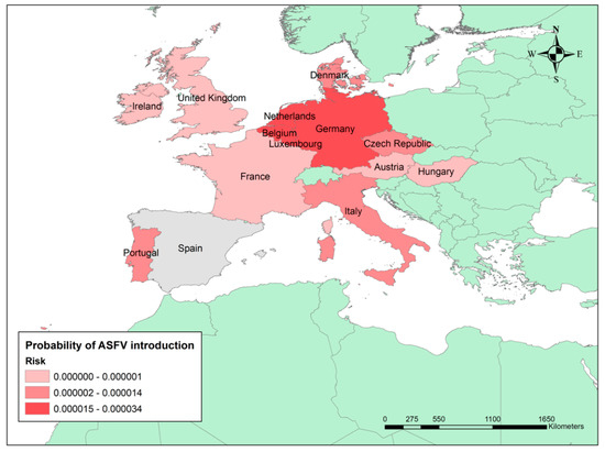The countries of origin with the highest risk were Germany (3.39 × 10−5), the Netherlands (1.90 × 10−5), Belgium (1.58 × 10−5), Luxembourg (1.53 × 10−5), and Portugal (1.49 × 10−5). Actually, these countries represent 92% of the overall annual risk of ASFV introduction into Spain (see Figure 2).