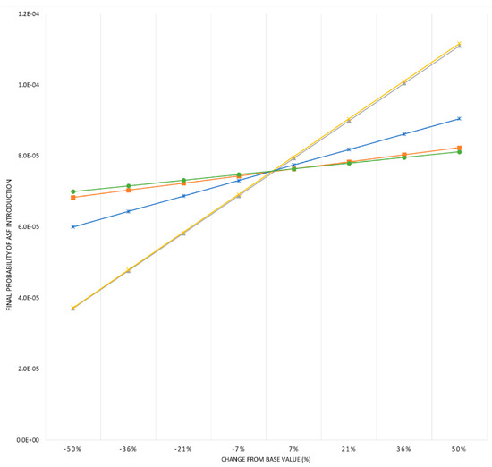 Advanced sensitivity analysis. Graph represents variations in the overall probability of ASF introduction into Spain by legal import of live pigs as a consequence of changes in the parameters with the strongest influence on the model: probability of selecting an ASF-infected pig from Portugal (■, orange colour), Germany (✱, blue colour), and Belgium (●, green colour); probability of surviving ASF infection (▲, grey colour) and probability of surviving transport (𝗫, yellow colour).