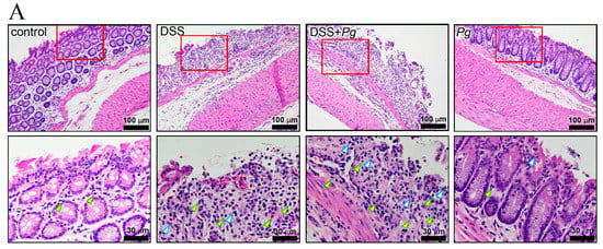 Colon length has been proven to be a biological marker in assessing colonic inflammation: the shorter the colon, the more severe the colitis [33]. Figure 3A illustrates the colons of each group; the length of colons was measured at the end of the experiment (seven days after treating DSS). In Figure 3B, there was no significant difference between the control and Pg-alone groups; the 4% DSS treatment group had shorter colons, and the shortest colon was found in the 4% DSS plus Pg group. DSS treatment clearly caused colitis, but Pg infection by itself showed no marked effect on clinical signs of colitis. However, in the 4% DSS plus Pg group, the highest DAI score, and the shortest colon revealed that Pg treatment exacerbated the inflammatory response of the colon and was associated with IBD. The data in Figure 4 demonstrated that the clinical signs, including colon length and DAI score, showed similar patterns.
