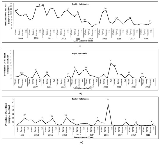 Long-term trends of S. enterica prevalence among the different poultry commodities were illustrated after estimating the annual prevalence for the 2009 to 2018 period. Additionally, seasonal prevalence patterns were visualized for each poultry commodity. For this purpose, and in keeping with previous Canadian studies, winter was defined as January to March, spring as April to June, summer as July to September, and fall as October to December. Seasonal prevalence was estimated by dividing the total number of S. enterica-positives from all hatcheries for each season by the total number of samples that were submitted during the same season and multiplying by 100.
