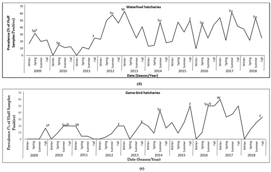Overall, there was an increasing trend in the prevalence of S. enterica from game-bird fluff samples during the study period, peaking at 43.5% in 2017 (Figure 1). Most peaks occurred in the fall or summer (Figure 2e). Trends for the most common serovars are illustrated in Figure 3e. There was an increasing trend in the prevalence of S. enterica ser. Typhimurium, peaking in 2017. Salmonella enterica ser. Indiana was not detected among game-bird hatcheries before 2017.
