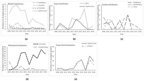 Trends in the prevalence of Salmonella enterica serovars isolated from fluff samples submitted through the Ontario Hatchery and Supply Flock Policy between 2009 and 2018, by poultry commodity. The y-axis scale may differ between graphs so that details can be observed. (a): broiler hatcheries; (b): layer hatcheries; (c): turkey hatcheries; (d): waterfowl hatcheries; (e): game-bird hatcheries.