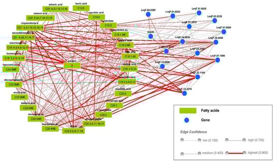 This analysis demonstrates the diverse interaction between genes involved in fatty acid synthesis and fatty acid compounds. Indeed, LmjF14.0510 coding for Δ9 type I desaturase highly interacted with C18:1Δ9; this latter also interacted with LmjF.33.3270 Δ12 desaturase, LmjF.32.1160 Δ6 desaturase (Elo6), and C18:3n-6 and C20:3n-6. We also noticed a strong connection between LmjF07.1090 Δ5 desaturase and C20:3n-6 as well as C20:4n6. These in silico results indicate the predominance of polyunsaturated fatty acid in the Leishmania major promastigote.