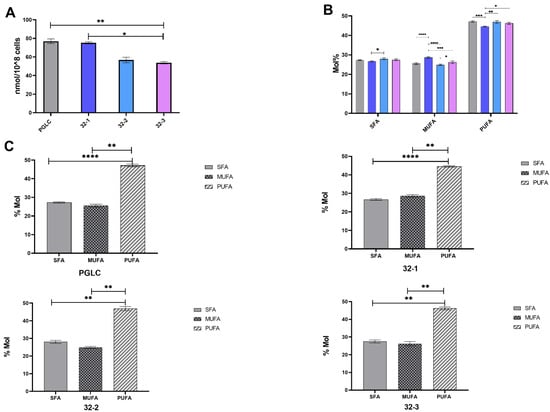 Finally, polyunsaturated fatty acids are essentially composed of C18:2, C18:3, C22:6, C20:2, and C20:3n-3/n-6. PUFAs are statistically the predominant fatty acid class in all our clones. However, significant differences were observed between the different clones regarding the abundance of PUFA (Figure 2B,C). These findings are in line with the in silico analysis (Figure 1).