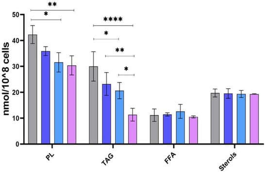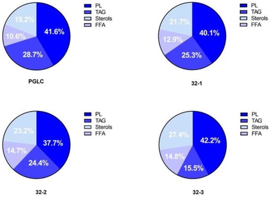 Based on the variation identified in terms of total lipid (total fatty acid content extracted from total lipid pools) content, we investigated the abundance of phospholipids (PLs), free fatty acids (FFAs), and neutral lipids (i.e., triacylglycerol (TAG) and sterols (cholesterols and ergosterol) in all of our L. major promastigotes. The total lipids were separated using TLC 1D and analyzed by GC-MS. Our results (Figure 3) show that for all Leishmania parasites, PLs were the most predominant lipid class ranging from 37.7% to 42.2%, followed by TAG, demonstrating a relative abundance ranging from 15.5 to 28.7%. Sterols were also detected with a relative abundance comprised between 19.2% and 27.4% and finally, FFA represented a lower portion with 10.6% for PGLC and 14.8% for 32-3.