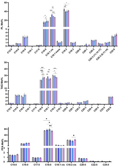 Fatty acid composition of the PL, TAG, and FFA fractions in Leishmania major promastigotes isolated from human and rodent. Molar percentages (Mol%) were calculated relative to the total lipids for each strain. PL (phospholipids), TAG (triacylglycerol), sterols, and free fatty acids (FFA). PGLC (grey), 32-1 (blue). 32-2 (light blue) and 32-3 (purple). Data are the means ± SEM of 3 independent determinations. (ANOVA test) * p ≤ 0.05, ** p ≤ 0.01, *** p ≤ 0.0005, **** p < 0.000004 significant differences between the different Leishmania promastigote.