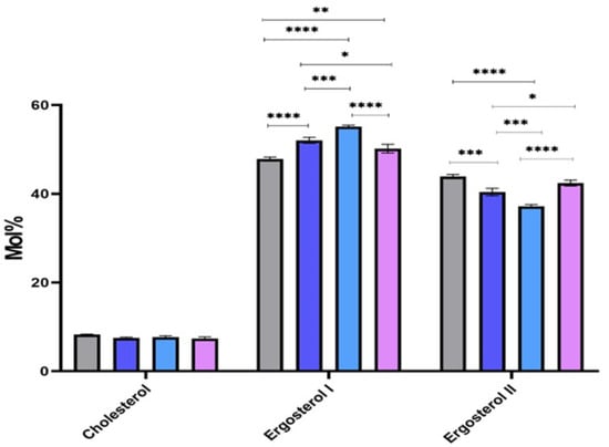 Sterols identified by gas chromatograph-mass spectrometry (GC-MS) in Leishmania major promastigotes isolated from human and rodent. Molar percentages (Mol%) were calculated in relative to the total lipids for each strain. PGLC (grey), 32-1 (blue), 32-2 (light blue), and 32-3 (purple). Data are the means ± SEM of three independent determinations. (ANOVA test) * p ≤ 0.05, ** p ≤ 0.01, *** p ≤ 0.0003, **** p < 0.000004 significant differences between the different Leishmania promastigote.