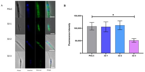 As shown in Figure 7A, there were variations in the fluorescence intensity of LD among the different isolates, which suggests their heterogeneity regarding the abundance of neutral lipids. However, this fluorescence intensity variation was statically significant only between PGLC and 32-3. (Figure 7B). These results confirm our observations regarding the abundance of TAGs in this clone (Figure 4).