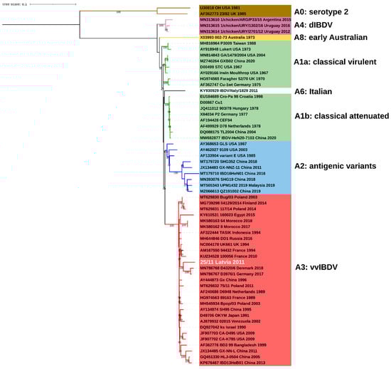 Phylogenetic tree based on full coding sequence of IBDV for viral segment A (3076nt) using 60 reference strains retrieved from GenBank and maximum likelihood (ML) method, GTR+F+I+G4 model. The main IBDV genogroups according to classification of Islam et al. [] are denoted (A1: green, A2: blue, A3: red, A4: purple, A6: white, A8: yellow, A0: brown).