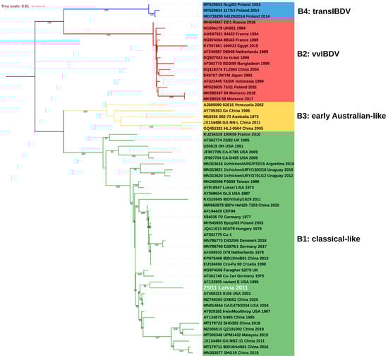 Phylogenetic tree based on full coding sequence of IBDV for viral segment B (2640nt) using 59 reference strains retrieved from GenBank and maximum likelihood (ML) method, GTR+F+I+G4 model. The main IBDV genogroups according to classification of Islam et al. [] are denoted (B1: green, B2: red, B3: yellow, B4: blue).