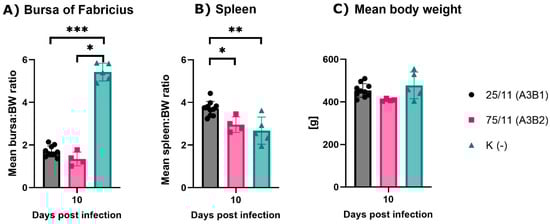 The obtained data were analyzed using Graphpad Prism software 9.4.1 (Graphpad Prism Software Inc., San Diego, CA, USA). The mean with SD of ratios of bursa or spleen to body weight (B-BW and S-BW) and mean body weight calculated for each bird from the experimental groups were compared using the Mann–Whitney test. The results with p < 0.05 were considered statistically significant.