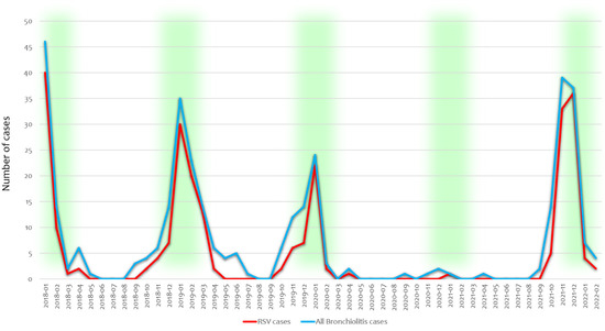 Trends in hospitalizations for all-virus-related bronchiolitis (blue curve) and RSV-related cases (red curve). Green indicates the usual expected bronchiolitis season in Italy before COVID-19, from October–November to March–April, peaking in January–February.