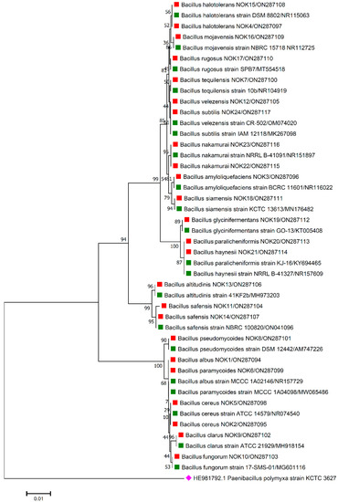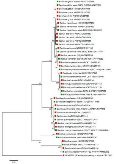 Phylogenetic tree based on partial 16S rRNA sequences of endophytic Bacillus strains (indicated by red colour square) allied with anthesis stage of wheat (cv. DBW187) along with those of maximum similar entries of type strains (indicated by green colour square) from database. The tree is constructed by neighbour-joining method with 1000 bootstrap replications. The scale bar represents the number of changes per base position. Paenibacillus polymyxa strain KCTC 3627 (HE981792.1) was used as an out-group strain (indicated by pink colour rhombus).
