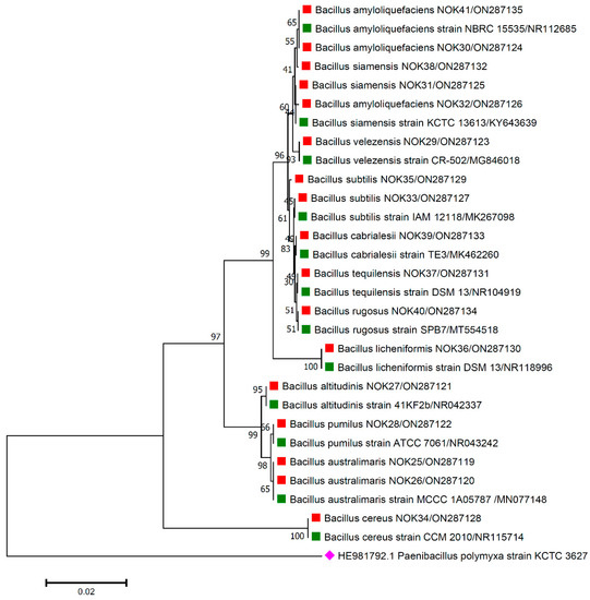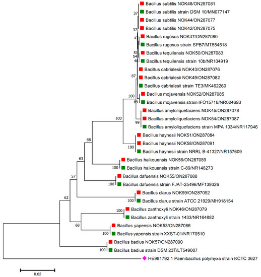 For the accurate identification of bacterial endophytes and detection of genes linked with antimicrobial peptides (AMPs) produced by Bacillus, isolation of the total genomic DNA of each bacterium was carried out as per the protocol of Pospiech and Neumann [37]. Amplification of 16S rRNA region and AMP genes was carried out in a thermocycler machine (Q cycler 96, Hain Lifescience UK Ltd., Surrey, UK), and conditions of PCR reaction are described in Table 1. For the identification of bacterial endophytes, generated amplicons of ~1500 bp were sent to Eurofins genomics sequencing services, India, for DNA sequence analysis. The matching of 16S rRNA gene sequences of bacterial endophytes was made against the sequences available in the EZ Biocloud e-server (https://www.ezbiocloud.net/, accessed on 10 December 2021) to identify their nearest match. Molecular Evolutionary Genetics Analysis (MEGA) version 11 [38] tool was used for the construction of phylogenetic tree with nearest type strain sequences of Bacillus sp. available in National Center for Biotechnology Information (NCBI; https://www.ncbi.nlm.nih.gov/, accessed on 2 February 2022) database. The gene sequences were deposited in the NCBI databank to get the gene accession numbers (Figure 1, Figure 2, Figure 3, Figure 4 and Figure 5). The alignments of the 16S rRNA gene sequences of bacterial endophytes, along with matching type strains, were conducted with the help of Clustal W [39]. The multiple sequence alignment profiles were used to build the best fit phylogenetic tree using the neighbor-joining method [40] with Kimura’s two-parameter model [41] executed in MEGA version 11 software [38]. Bootstrap analysis was performed to assess confidence levels for the branches with 1000 replicates [42].