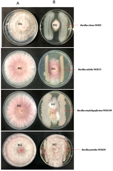 In-vitro interaction between endophytic Bacillus strains and F. graminearum NFG1 in a dual culture on NA: PDA plate at 5th day after incubation at 28 ± 2 °C. (A) A 5-mm agar plug of F. graminearum NFG1 on center of PDA plate and (B) Endophytic Bacillus strains inoculated on two corners of PDA plate with equal distance from the colony of F. graminearum placed at the centre. FG = F. graminearum NFG1. Bacillus pumilus NOK68 serve as a neutral bacterial strain.