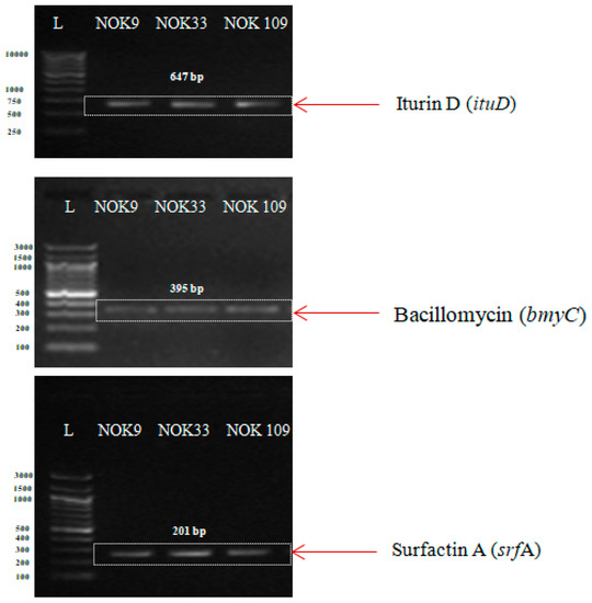 PCR amplification of AMP genes in three endophytic Bacillus strains (B. clarus NOK09, B. subtilis NOK33, and B. amyloliquefaciens NOK109) were displayed in Figure 7. Amplification of the iturin (ituD), bacillomycin (bmyC), and surfactin (srfA) gene produced a single specific amplicon of 647, 395, and 201 bp, respectively, in NOK9, NOK33, and NOK109 strains.