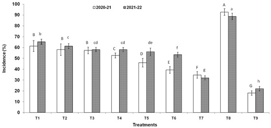 Disease incidence (%) of Fusarium head blight disease observed during 2020-21 and 2021-22 field trials conducted on susceptible wheat cultivar (cv. PBW343). On x axis, treatments are: T1 (NOK9 + NFG1), T2 (NOK33 + NFG1), T3 (NOK109 + NFG1), T4 (NOK9 + NBOK33 + NFG1), T5 (NOK 9 + NOK109 + NFG1), T6 (NOK33 + NOK109 + NFG1), T7 (NOK9 + NOK33 + NOK109 + NFG1), T8 (F. graminearum NFG1), and T9 (Propiconazole @ 0.1%+ + NFG1). Data were analyzed for significance with an analysis of variance (ANOVA) followed by DMRT test (p = 0.05). Values with different letter indications represent a statistically significant difference.