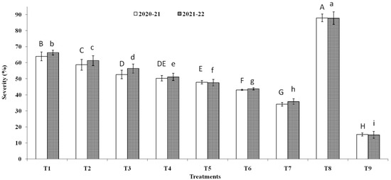 Disease severity (%) of Fusarium head blight disease observed during 2020-21 and 2021-22 field trials conducted on susceptible wheat cultivar (cv. PBW343). On X-axis, treatments are: T1 (NOK9 + NFG1), T2 (NOK33 + NFG1), T3 (NOK109 + NFG1), T4 (NOK9 + NBOK33 + NFG1), T5 (NOK 9 + NOK109 + NFG1), T6 (NOK33 + NOK109 + NFG1), T7 (NOK9 + NOK33 + NOK109 + NFG1), T8 (F. graminearum NFG1), and T9 (Propiconazole @0.1% + NFG1). Data were analyzed for significance with analysis of variance (ANOVA) followed by DMRT test (p = 0.05). Values with different letter indications represent a statistically significant difference.