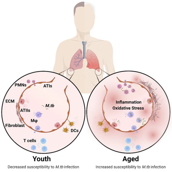 Tuberculosis (TB) has scourged humankind through the centuries. It is considered a global threat claiming more than 4000 lives every day, resulting in approximately 1.3 million deaths in 2020 [1,2]. This has, in part, been aggravated by the COVID-19 pandemic, which restricted access to TB diagnosis and treatment [3,4,5]. TB is a chronic inflammatory disease caused by the bacillus Mycobacterium tuberculosis (M.tb), which is easily spread from one person to another by airborne droplet nuclei. These aerosolized particles transit past the nasopharyngeal region to be delivered into the distal airways, e.g., the alveolus [6]. Although M.tb typically affects the lungs (pulmonary TB), other organs can also be vulnerable (extrapulmonary TB). Increased risk of TB disease and mortality are associated with populations that have compromised immunity, such as HIV-infected individuals, infants, and the elderly [7,8,9]. The main focus of this review is to discuss why the elderly are more susceptible to TB disease and death.