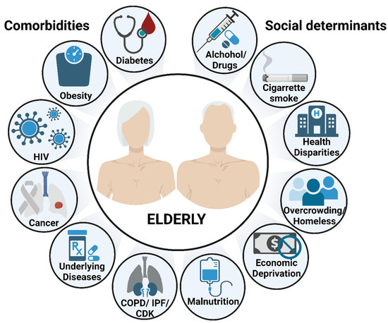 Risk factors of TB disease and mortality in the elderly. Aging by itself is a major risk factor to develop and succumb to TB, partially due to the waning immunity that characterizes the elderly population. Additional risk factors, including comorbidities and socioeconomic determinants, are key drivers to increase even more the susceptibility of the elderly to respiratory infections. This illustration was created with BioRender (https://biorender.com/), accessed on 18 September 2022.