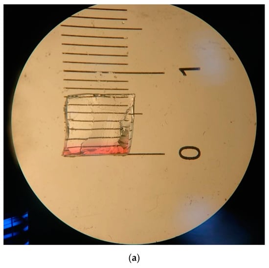After the fluorescent dye was attached to the icPad, it was allowed to stand at room temperature for 40 min, and then the sections were observed under a 20× and 40× microscope. The distance of fluorescent dye permeation on the surface of the icPad was 2.5 mm (Figure 6a,b), which was less than the thickness of 8 mm of the icPad. Due to the force of penetration being only 32% (2.5 mm/8 mm), the dye could hardly penetrate the icPad and come into direct contact with the human body during an ESWL procedure.