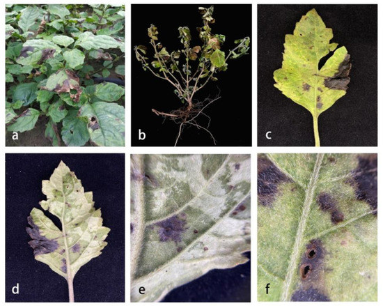 Symptoms of leaf spots caused by isolates in Pogostemon cablin. (a) Symptom in the field; (b) Infected plants; (c) The positive surface of an infected leaf; (d) The opposite side of an infected leaf; (e,f) A local area of an infected leaf.