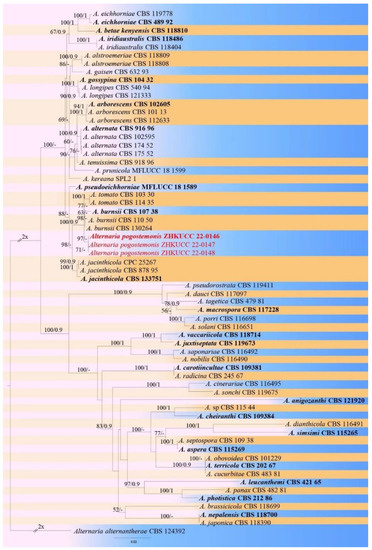Sequence quality was assured by validating chromatograms using BioEdit v5. The resulting sequences were checked against the National Center for Biotechnology Information (NCBI) search engine GenBank BLASTn (https://blast.ncbi.nlm.nih.gov/Blast.cgi, accessed on 12 January 2022). According to the BLAST results, the ITS, gapdh, rpb2, tef1-α, and Alt-a1 sequences obtained in this study were closely related to Alternaria. Relevant sequence data were downloaded using Genbank. The maximum likelihood (ML) in RAxML [24] was run for all the Alternaria species. After confirming that the strains from our study belonged to the A. alternaria species complex (AALSC), phylogenetic analysis was performed with these strains. The individual sequence dataset was aligned using MAFFT v.7, http://mafft.cbrc.jp/alignment/server accessed on 1 July 2022), and improved manually using BioEdit v5 [25] as required. Subsequently, the aligned datasets were concatenated manually. All sequences obtained in this study are deposited in GenBank (Table S1). Phylogenetic analyses were performed by ML in RAxML [24] and Bayesian analyses (BI) in Mr Bayes v. 3.0b4 [26].